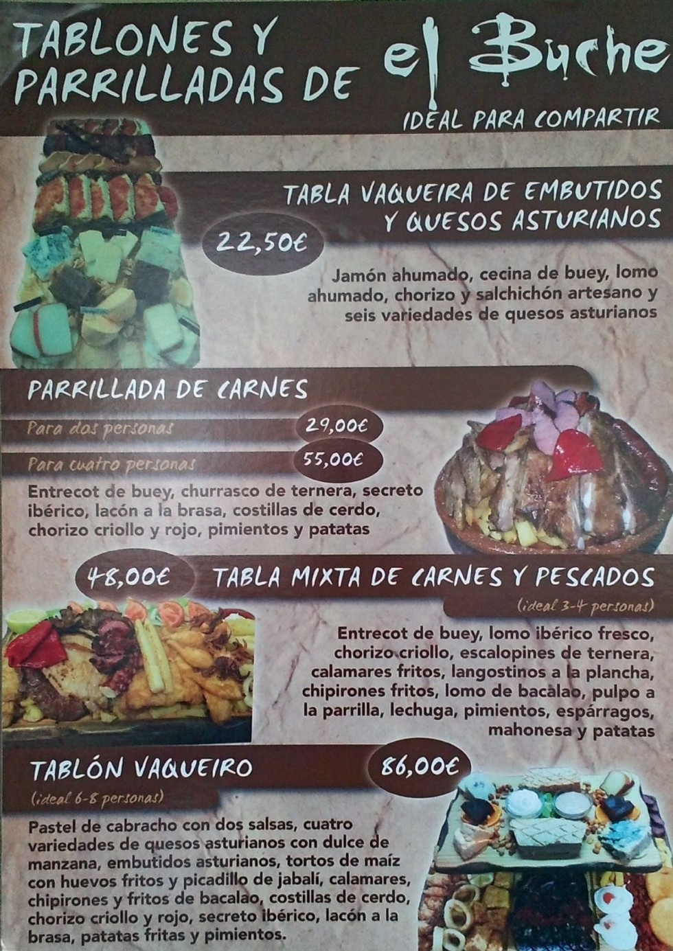 Además de una extensa variedad de tablones de parrilla, nuestra carta de platos dispone de una amplia representación de todos los tipos de quesos que existen en Asturias, de los mejores embutidos de la tierra y los tradicionales tortos de maíz.