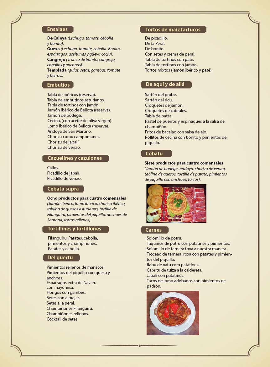 Nuestro plato estrella es conocido como El Cebatu, el cual está compuesto de ocho productos sobre una tabla de madera de haya. Quesos, tortos de maíz, pimientos, anchoas, chorizo de jabalí, lomo, jamón y tortilla de patatas con cebolla, hacen parte de este exquisito manjar.
