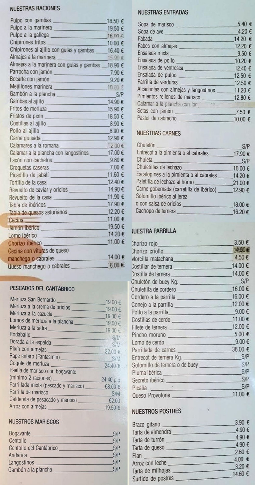 Menú Diario .Cocina Tradicional .Mariscos vivos
