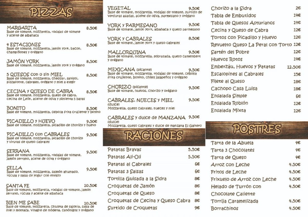 Raciones Variadas, Pizzas Asturianas, Postres Caseros...